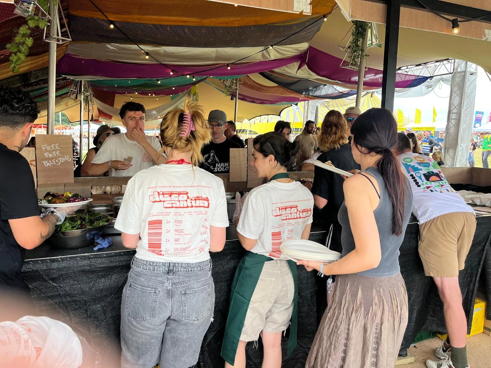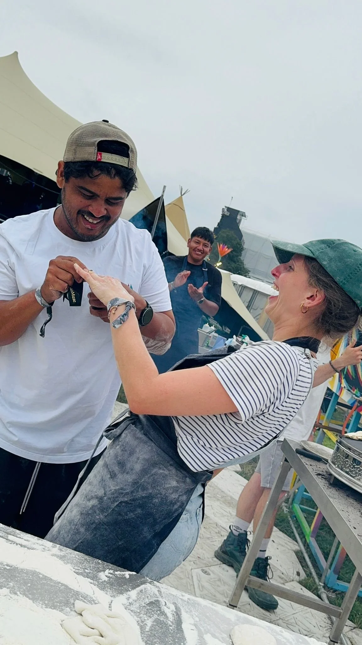 Lunchtime service was in full swing, we’d been serving non-stop for a few hours, and the line showed no sign of dwindling. Those of us firing flatbreads — Sofia, Jana and Jack — were making a big show of tossing them up in the air, spinning them around, in a All Together Now Sunday afternoon flow, dancing to the sounds of the MixMag tent adjacent to us.